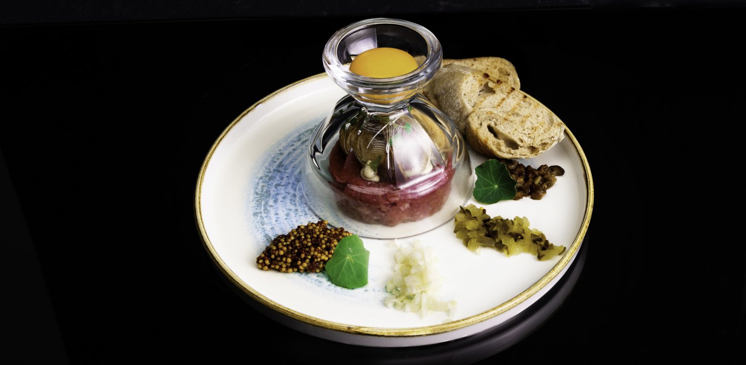 Onion, pickled cucumber, marinated bay bolete, purple potato chip, chive mayonnaise, croutons