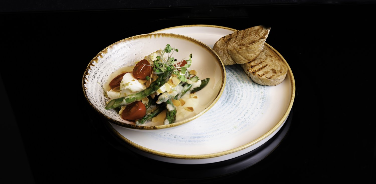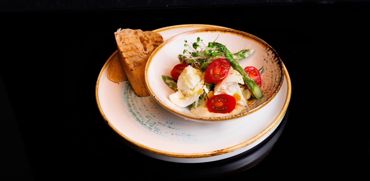 Romaine lettuce, cherry tomatoes, cucumber, smoked bacon powder, grana padano, Caesar dressing, croutons