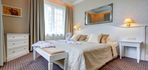 Odkryj eleganckie, dopracowane w każdym detalu pokoje dwuosobowe w stylu glamour w oddanym w 2017 roku Dworze Afrodyta, znajdującym się 150 m od budynku głównego.