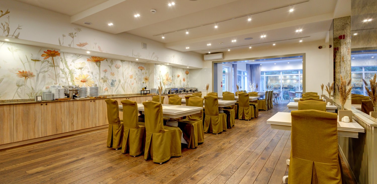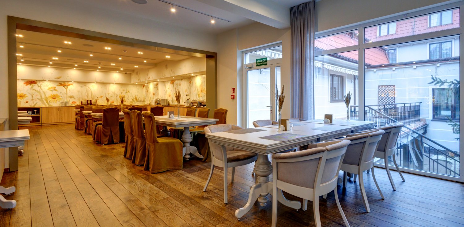 Jakość serwowanych śniadań świadczy o klasie hotelu. Dlatego dokładamy starań, aby nasz śniadaniowy bufet w pełni odpowiadał gustom naszych Gości. Serwujemy zarówno dania na ciepło (naleśniki, fasolka, parówki, jajka), jak i klasyczne propozycje śniadaniowe (nabiał, wędliny), owoce, warzywa. W niedziele kucharz na żywo przygotowuje znakomite omlety oraz gofry.